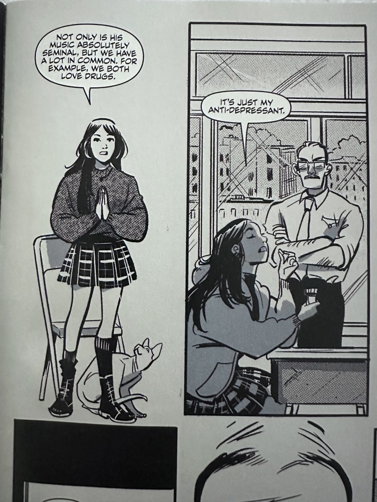 I didn’t care for this issue all that much. I could not relate with all the angst. That is to say, I can’t relate to a character that is so edgy that she would lie about the fact that she wasn’t underage drinking when she was and lies about the fact that she is just consuming “CBD” and “anti-depressants” when she is really doing drugs (Ash talked about all this when she was discussing all that she and Elliot had in common). Since I couldn’t relate with the character it made the whole thing fall flat to me.