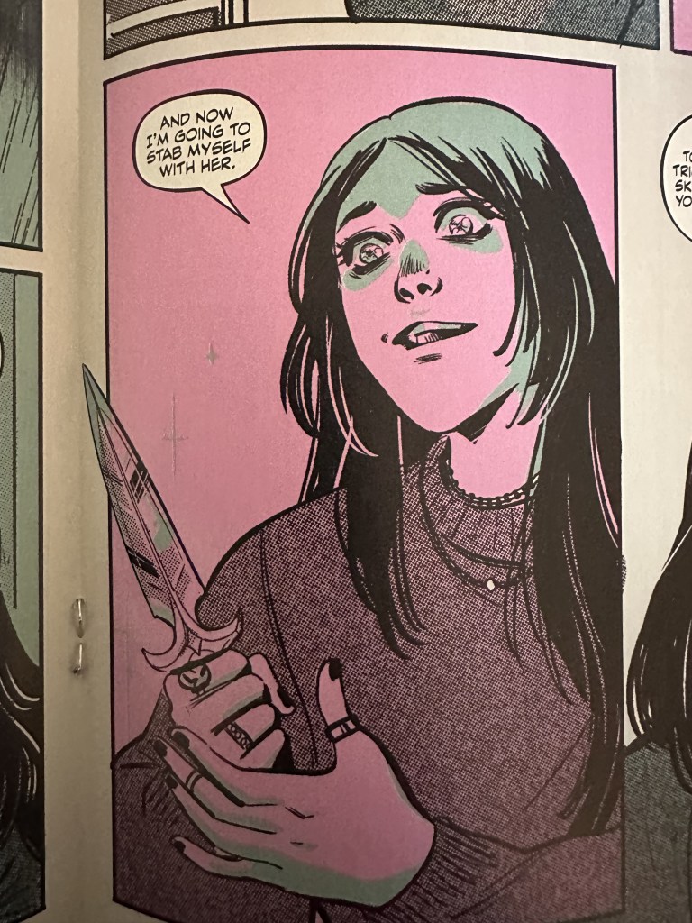 Then we get to the meat of this story. The point of Ash having this conversation with the reader is to divulge the fact that she wants to kill herself. She’s chronically depressed and tired, tired of the lows in her life, the doctors she has to see, and the meds she has to take, and so she just wants to end it all. Ash talks about Elliot because prior to the events of this issue, Elliot killed himself, specifically by stabbing. This inspired Ash to end her life the same way Elliot did.